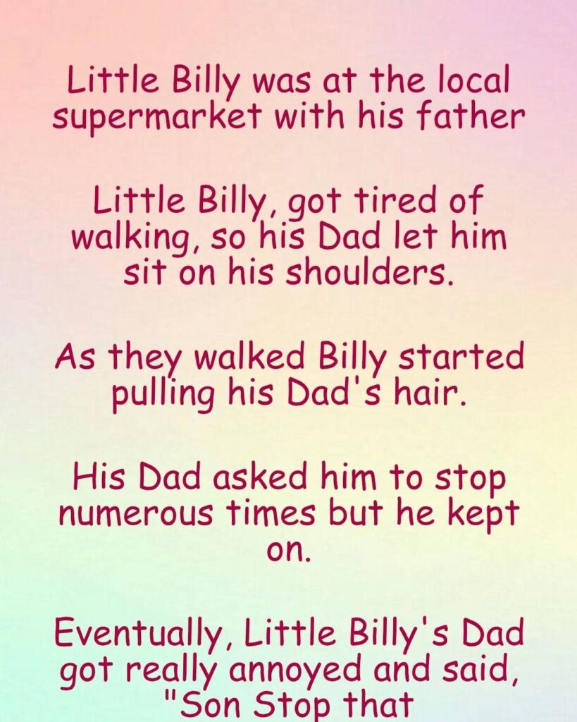 Little Billy got tired at the supermarket, so Dad let him ride on his shoulders. Suddenly, he started pulling Dad’s hair nonstop. Dad finally yelled, “Billy! Stop that right now!” Billy looked down and said, “But Dad… I’m just trying to get my chewing gum back!” 😂