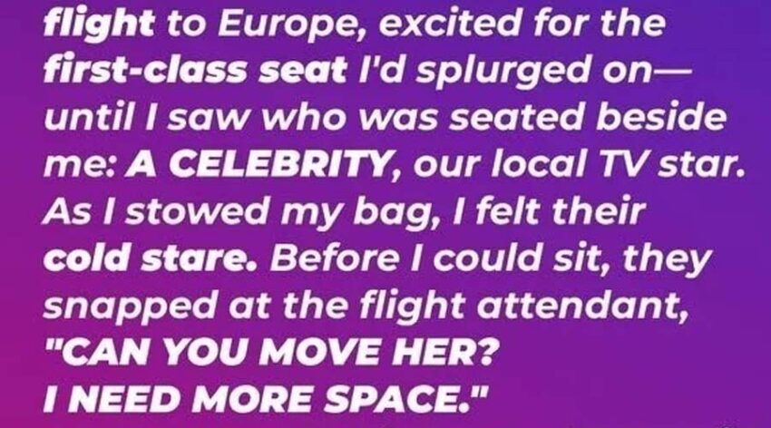 I had just boarded my long-haul flight to Europe, thrilled for the first-class seat I’d saved for. But the excitement faded when I saw who was beside me—our local TV star, famous and intimidating. Before I could sit, they glared at me and snapped at the flight attendant to move me calmly buckled my seatbelt and said, “I paid for this seat too.